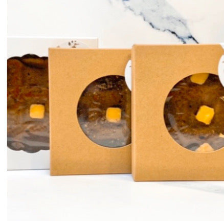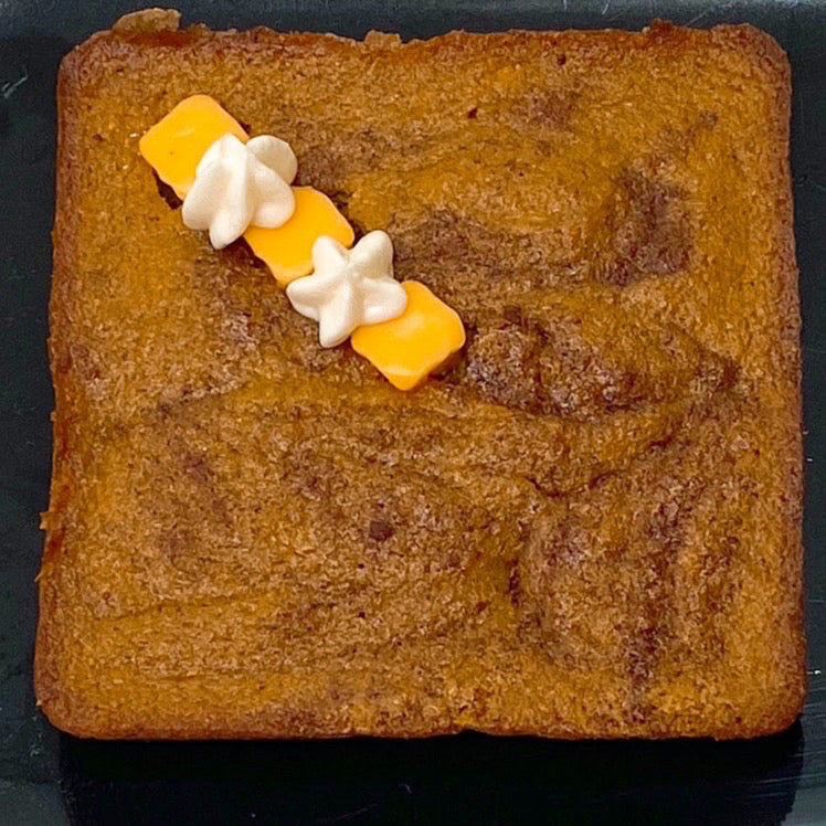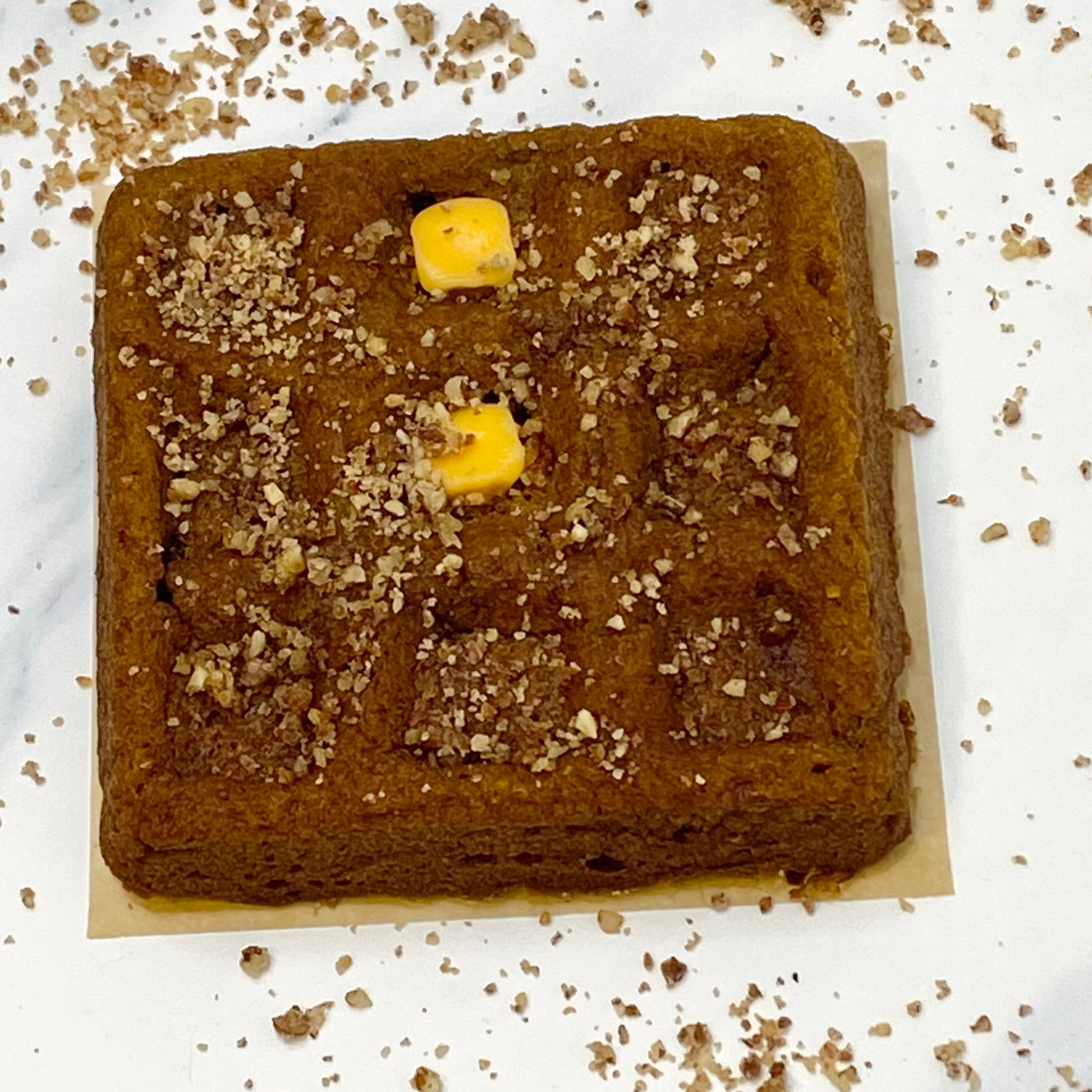 Our PumpKin Spice Waffle Squares are a medium sized square of moist rich buttery deliciousness! It comes Straightup or topped with Pecans and/or rolling in Dark Chocolate. It is irresistible in its denseness and with a light airy taste or an earthy nut taste or the richness of dark chocolate